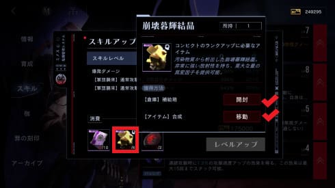 スキルレベル上げやランク上げに必要な資材がない場合、すぐに資材周回するのではなく、合成や補給箱を使用できないか1度確認をしよう